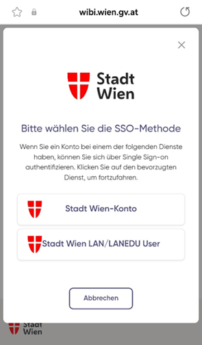 Klicken Sie auf den Button „Melden Sie sich mit Single Sign-On an“. Anschließend öffnet sich ein Pop-Up mit den Auswahlmöglichkeiten „Stadt Wien-Konto“ und „Stadt Wien LAN/LANEDU User“. Klicken Sie auf „Stadt Wien Lan/LANEDU User“.