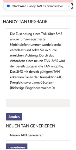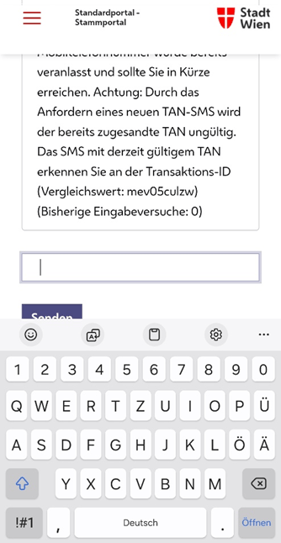 Wenn der TAN-Code via SMS erhalten wurde, diesen in das entsprechende Feld (wie am Screenshot) ersichtlich eingeben und anschließend auf den Button „Senden“ klicken.