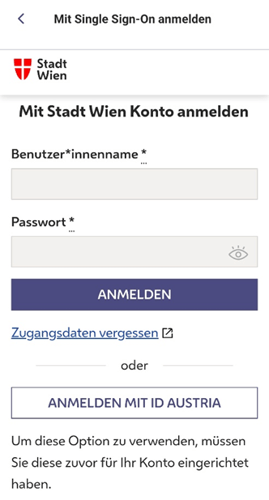 - Fügen Sie hier die Logindaten Ihres Stadt-Wien Kontos ein. Sie werden nun in der App angemeldet.