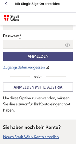 - Sie haben noch kein Stadt Wien Konto? – Dann klicken Sie auf „Neues Stadt Wien Konto erstellen“. Folgen Sie den Anweisungen auf dem Bildschirm, um Ihre Registrierung abzuschließen.