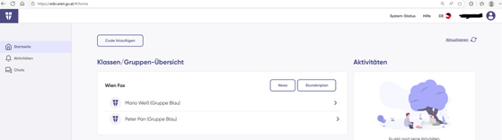 Anschließend öffnet sich die WiBi-Startseite mit der Bildungseinrichtung/den Bildungseinrichtungen bzw. der Gruppen-/Klassenübersicht Ihres Kindes/Ihrer Kinder.