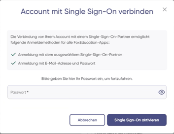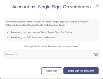 Mit einem Klick auf den Button „Single-Sign-On aktivieren“ öffnet sich ein Fenster, wo Sie aufgefordert werden, Ihr Passwort Ihres Fox Education Kontos einzugeben.