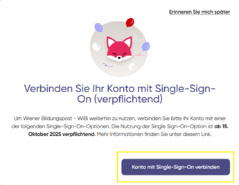 Sie erhalten in WiBi ein Pop-Up mit der Aufforderung Ihr Fox Education Konto mittels Single-Sign-On mit Ihrem Stadt Wien Konto zu verknüpfen.