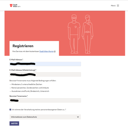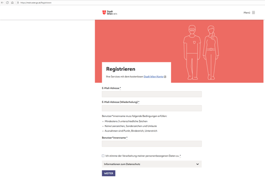 Oder rufen Sie direkt den Link https://mein.wien.gv.at/Registrieren auf.