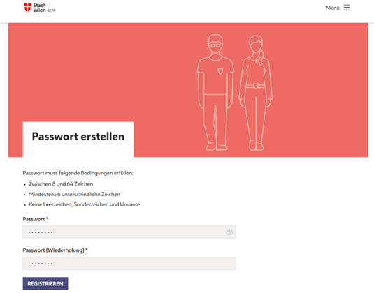 Legen Sie nun ein Passwort für Ihr Stadt Wien Konto fest. Klicken Sie anschließend auf den Button „REGISTRIEREN“.