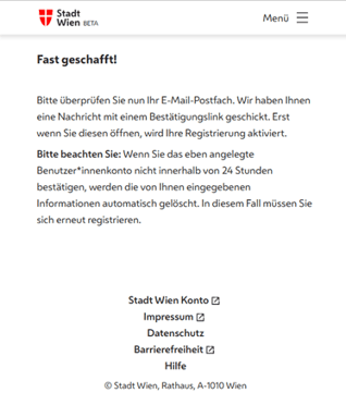 Wurde das Stadt Wien Konto erfolgreich bestätigt, erscheint folgende Meldung.