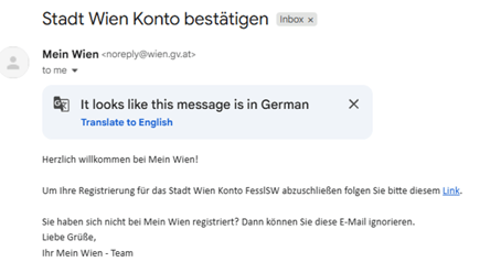 Sie erhalten nun eine E-Mail zur Bestätigung Ihres Stadt Wien Kontos an die E-Mail-Adresse, die Sie in Schritt 2 angegeben haben. Klicken Sie in der E-Mail auf den Link.